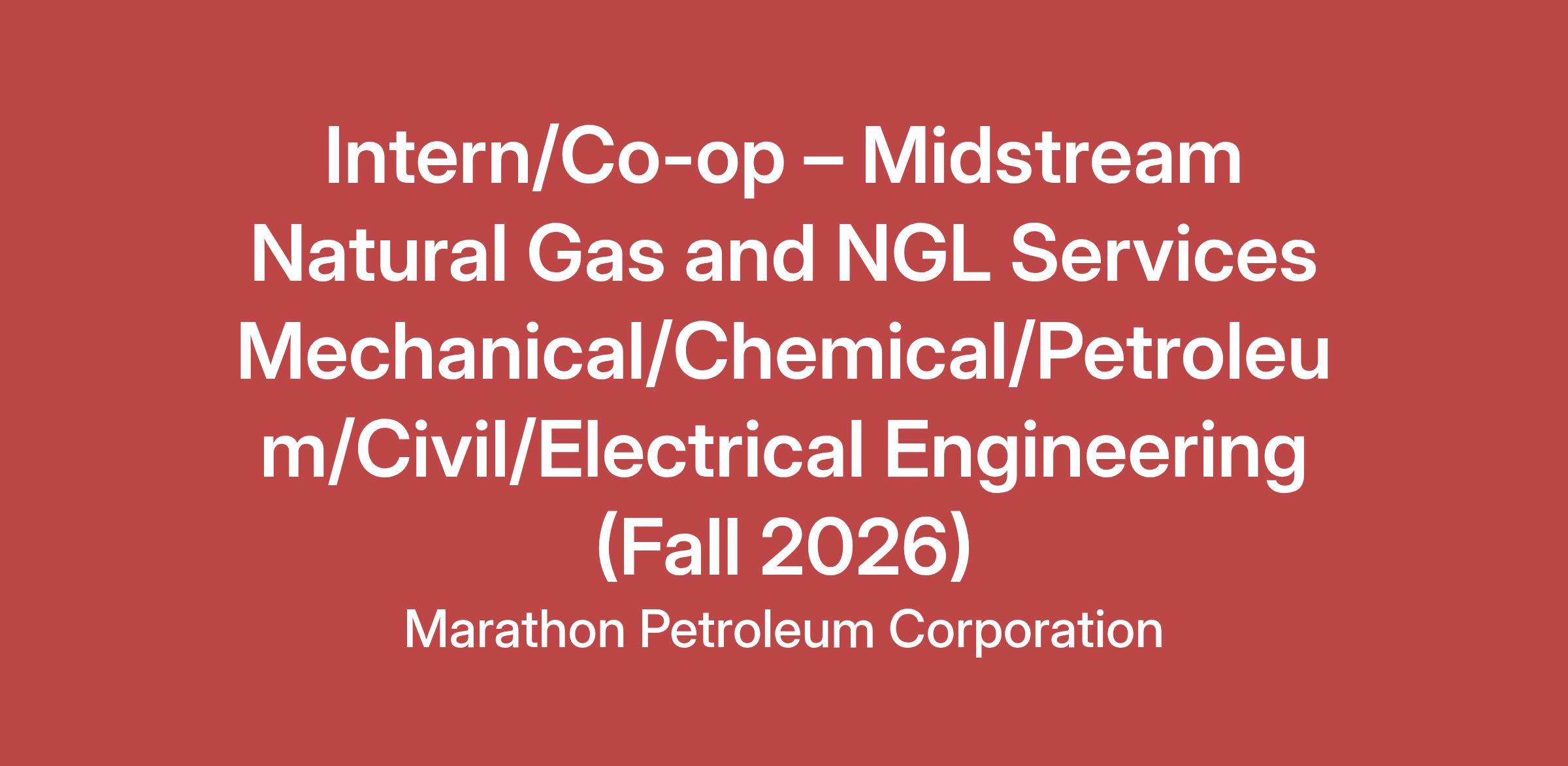 The Natural Gas and NGL Services (Gathering and Processing) Engineering Intern/Co-op manages all aspects of assigned projects including initial feasibility review and development of project scope, estimate, schedule, engineering design, equipment and material selection, project bidding, contractor selection, construction oversight, management of change, personnel and process safety, environmental oversight and all other project tasks to successfully accomplish goals for capital projects simultaneously within a managed budget and execution schedule. Responsibilities could include:
